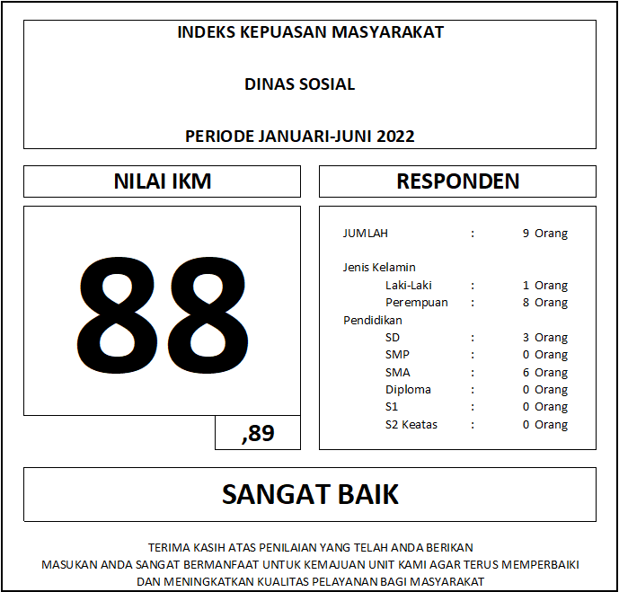 Posted on 1 Juli 202226 Agustus 2022 By adminwebdinsosSurvei Kepuasan Masyarakat (SKM) Semester I (Januari – Juni) Dinas Sosial Kota Banjarbaru Jumlah Pengunjung: 93